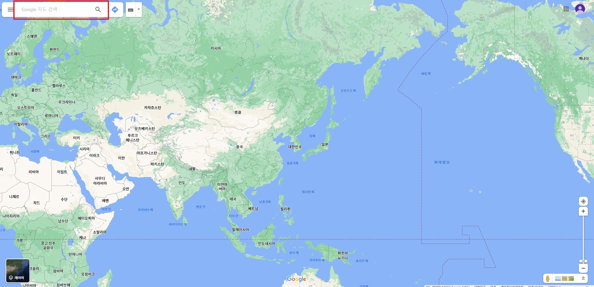 6. 이렇게 하면 세계지도를 볼 수 있으며, 자세히 보면 나라이름들이 한글로 적혀 있는 것을 확인할 수 있습니다. 이 상태에서 보고 싶은 곳을 확대하거나, 좌측 상단의 검색창을 통해 특정 장소를 검색할 수도 있습니다.