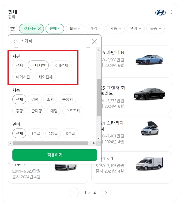 3. 상단 메뉴 중에 판매 버튼을 클릭하면 더 자세한 옵션을 선택할 수 있어요. 국내 시판, 국내 전체, 해외 시판, 해외 전체 등으로 분류돼 있어서 내가 원하는 판매 상태를 쉽게 확인할 수 있습니다. 또, 차종 선택도 가능해서 세단, SUV, 해치백 등 내가 원하는 차종만 골라서 볼 수 있어요. 이렇게 분류가 잘 되어 있어서 원하는 정보를 찾기 편리해요.