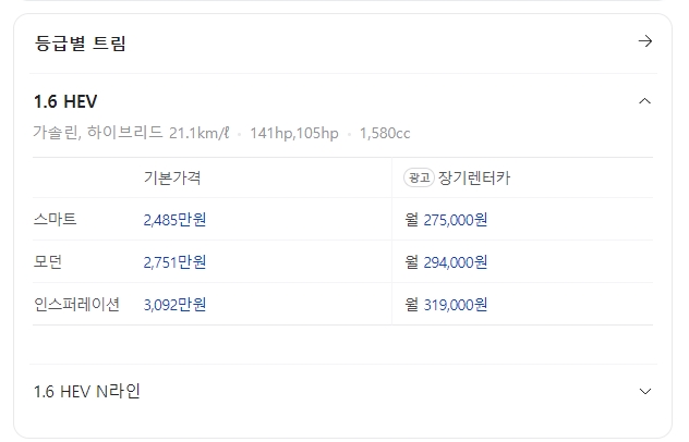 7. 등급별로 트림 가격도 상세히 나와요. 옵션별로 가격 차이가 어떻게 나는지 한눈에 볼 수 있어서 비교하기 쉽습니다. 다양한 트림을 보고 내가 원하는 옵션을 선택할 수 있어요. 예를 들어, 기본형부터 최고급형까지 가격과 제공되는 옵션들이 다르게 나와 있어서, 자신에게 맞는 트림을 선택하는 데 큰 도움이 돼요.