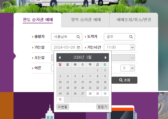출발 날짜는 달력 아이콘을 통해 쉽게 설정할 수 있고, 시간도 원하는 대로 조정한 후에 조회 버튼을 누르면 됩니다. 이렇게 하면 필요한 버스 시간표를 바로 찾아볼 수 있습니다.