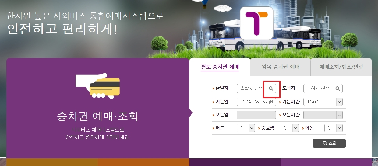 홈페이지 메인에서 승차권 예약이나 조회를 간편하게 할 수 있습니다. 출발지 선택 아이콘을 클릭하면 서울남부터미널을 포함한 여러 터미널을 선택할 수 있는 창이 나타납니다.