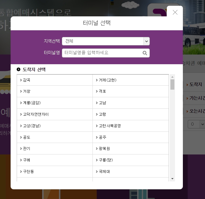 이어서 도착지 선택을 하면, 서울남부터미널에서 갈 수 있는 다양한 목적지를 볼 수 있습니다. 이 목록에서 원하는 도착지를 선택하면 됩니다.