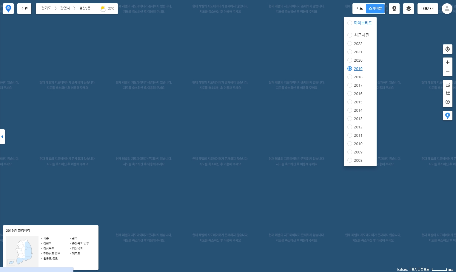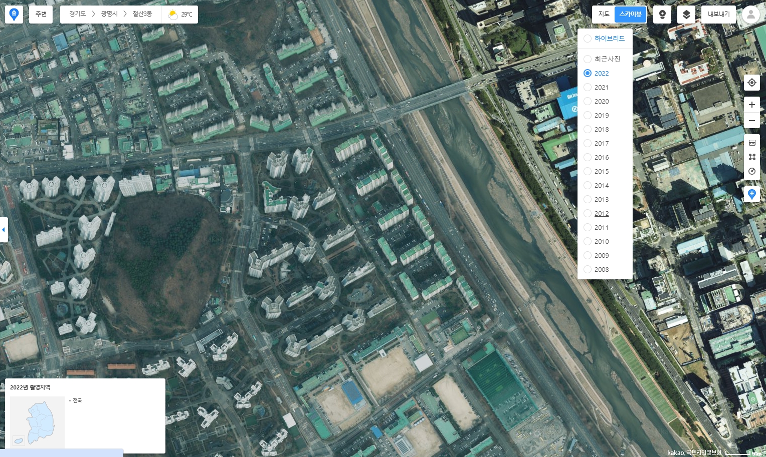 5. 위성 지도는 연도별로 확인할 수 있는데, 매년 전국이 촬영된 것은 아니에요. 그러나 2022년 이후로는 전국이 촬영된 것 같아요. 예전에 특정 지역을 검색했을 때 최신 이미지가 없어서 불편했는데, 최근에는 거의 모든 지역이 최신 상태로 업데이트된 것 같아요.