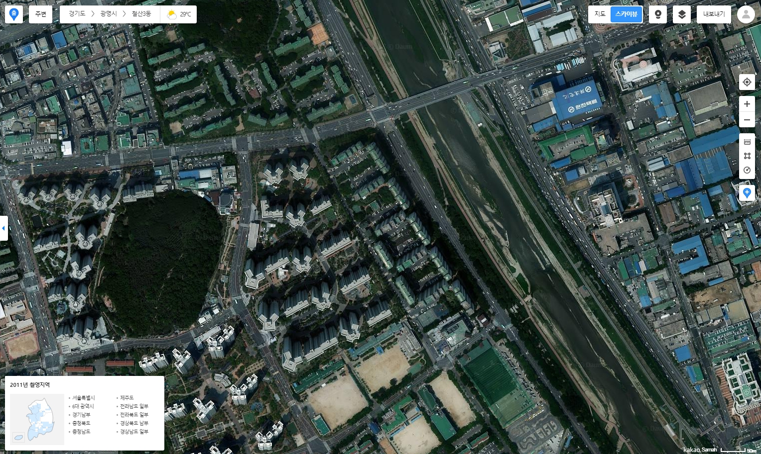 2. 지도를 사용하다가 위성 지도로 전환하고 싶다면, 화면 우측 상단에 있는 위성지도 버튼을 클릭하면 됩니다. 이 버튼을 누르면 바로 위성 지도로 전환됩니다.