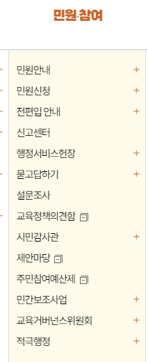 5. 네 번째로 민원·참여 메뉴를 통해 다양한 민원 처리와 참여 활동 정보를 확인할 수 있습니다. 민원 안내, 전편입 안내, 신고센터, 설문조사, 교육정책 의견 수렴 등 다양한 기능이 제공되며, 주민참여예산제와 같은 참여 프로그램도 여기서 확인할 수 있습니다.