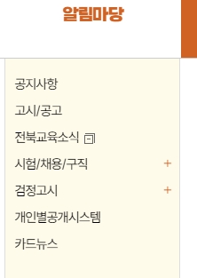 7. 마지막으로 알림마당 메뉴에서는 공지사항, 고시/공고, 전북교육소식, 시험/채용/구직, 검정고시 등의 정보를 확인할 수 있습니다. 이 메뉴는 전라북도 교육청의 최신 소식을 확인할 수 있는 곳으로, 중요한 공지나 채용 정보를 빠르게 접할 수 있습니다.