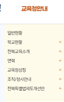 2. 첫 번째로 교육청안내 메뉴를 확인할 수 있습니다. 이곳에서는 전라북도 교육청의 일반 현황, 학교 현황, 연혁, 교육청 상징, 조직 안내, 전북특별법 제도 개선안 등 다양한 정보를 찾을 수 있습니다. 이 메뉴는 교육청의 전반적인 개요와 조직 구조에 대해 이해할 수 있도록 도와줍니다.