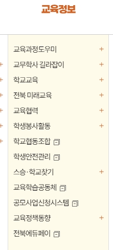 3. 두 번째로 교육정보 메뉴가 있습니다. 이 메뉴에서는 교육과정도우미, 교무학사 길라잡이, 학교교육, 전북 미래교육, 교육협력 등 교육과 관련된 다양한 정보와 자료를 제공하고 있습니다. 학생생활 활동과 학교 협동조합 등 학생 지원 프로그램도 이곳에서 확인할 수 있습니다.