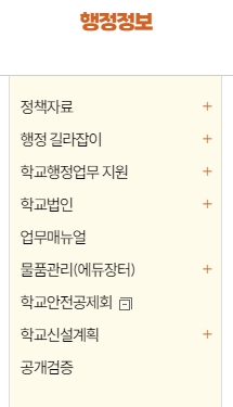 4. 세 번째로 행정정보 메뉴가 있습니다. 이 메뉴에서는 정책자료, 행정 길라잡이, 학교행정업무 지원, 학교법인, 업무 매뉴얼 등 학교와 관련된 행정 정보를 제공합니다. 또한, 물품관리와 학교 안전 공제회 등 실질적인 학교 운영에 필요한 정보들도 확인할 수 있습니다.