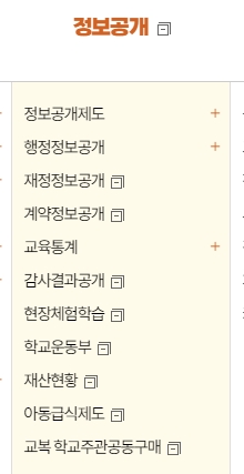 6. 다섯 번째로 정보공개 메뉴가 있습니다. 이 메뉴에서는 정보공개제도, 행정정보공개, 재정정보공개, 계약정보공개, 교육통계 등 투명한 행정을 위한 다양한 정보가 제공됩니다. 학교운동부와 아동급식제도와 같은 구체적인 운영 정보도 이 메뉴를 통해 공개됩니다.