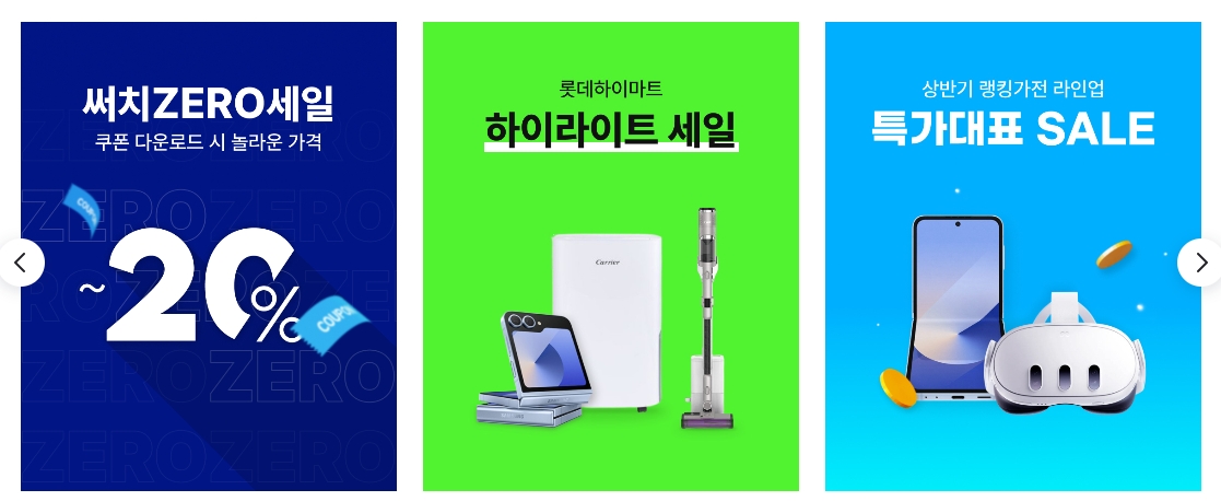 2. 하이마트 쇼핑몰의 첫 화면에서는 써치 ZERO세일, 하이라이트 세일, 특가대표 SALE과 같은 프로모션을 통해 인기 상품들을 할인된 가격으로 만나볼 수 있습니다. 다양한 제품군에서 큰 폭의 할인을 받을 수 있는 이 기회는 쇼핑객들에게 큰 매력을 제공합니다.