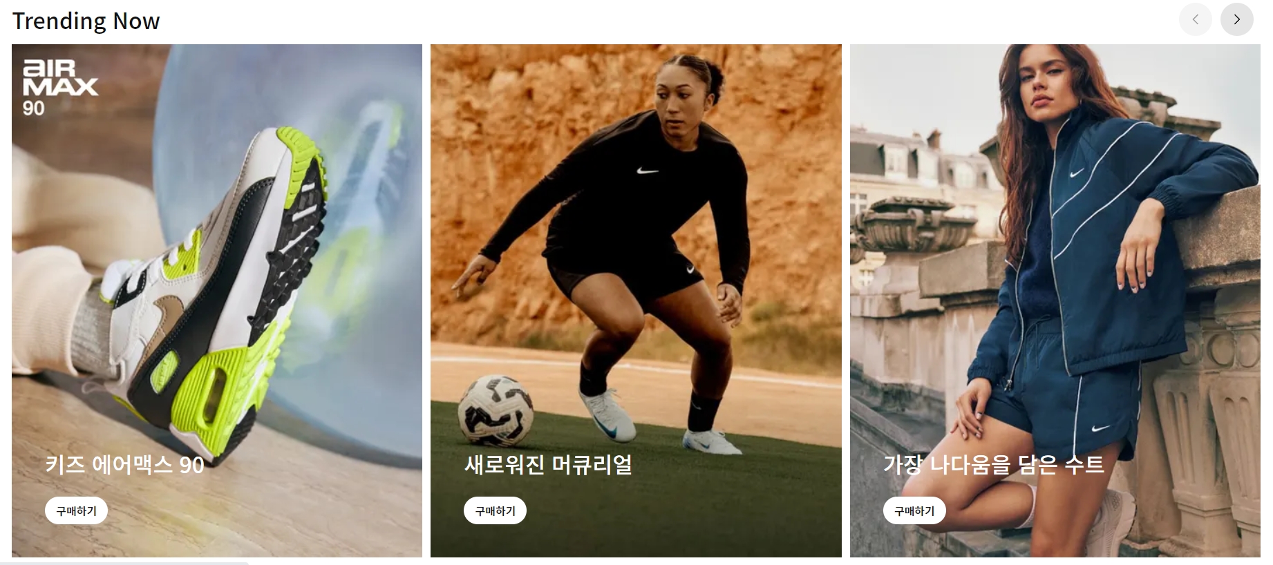 5. 지금 트렌드로 떠오르고 있는 제품들은 Trending Now 섹션에서 확인할 수 있어요. 예를 들어, 키즈 에어맥스 90, 새롭게 출시된 머큐리얼, 가장 나다움을 담은 수트 등 핫한 제품들이 소개되고 있습니다.