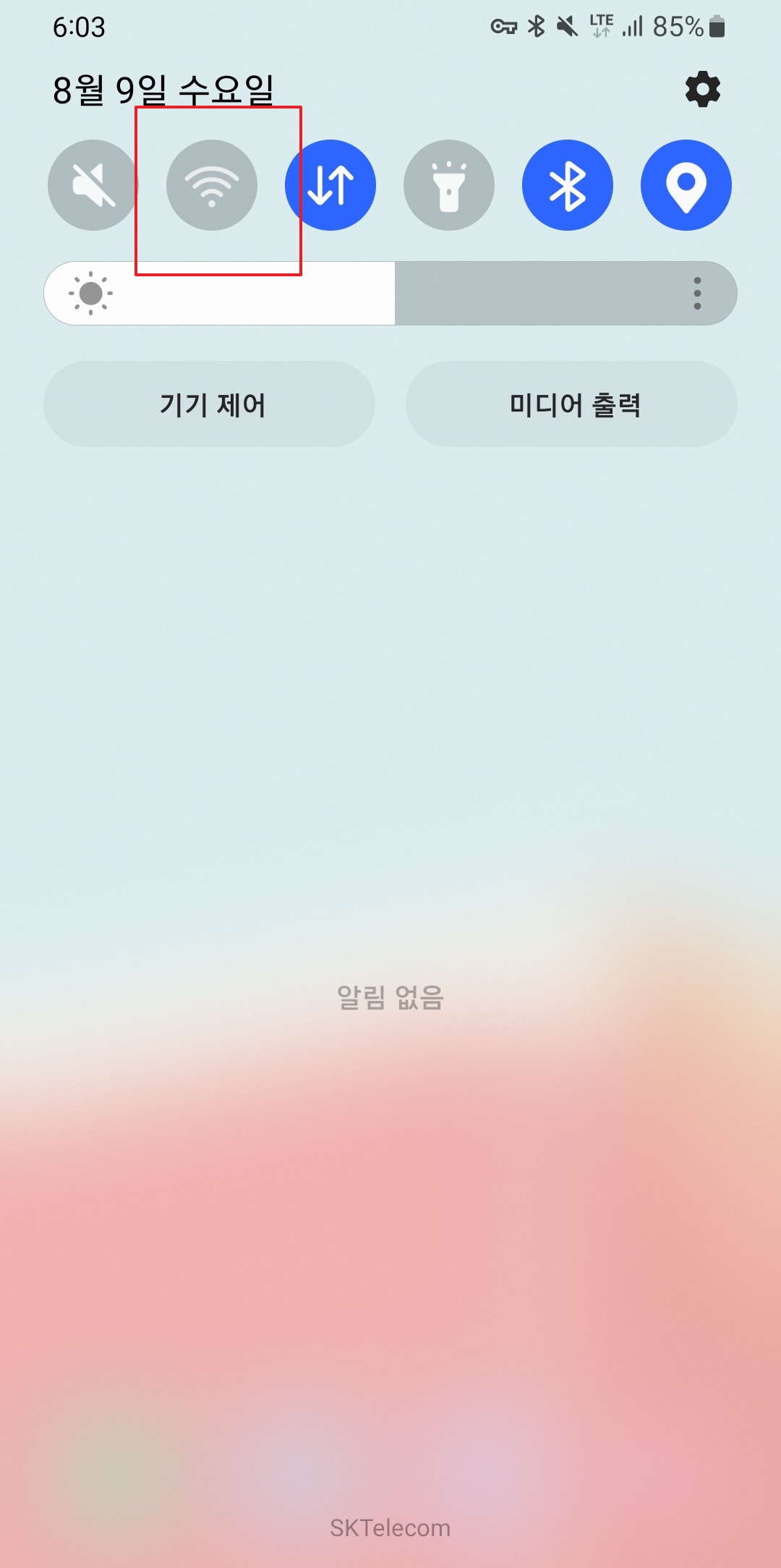 3. 와이파이 아이콘이 파란색으로 바뀌며 켜졌지만, 처음 연결하는 네트워크라면 자동으로 연결되지 않습니다. 이때는 와이파이 아이콘을 꾹 눌러 설정 페이지로 들어갑니다.