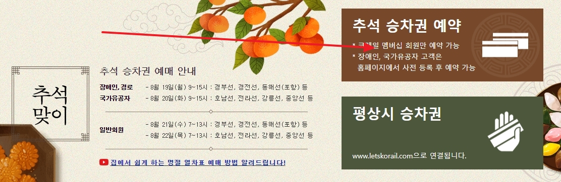 2. 우측 상단에 있는 추석 승차권 예약 버튼을 클릭하면 예매 절차를 시작할 수 있어요.