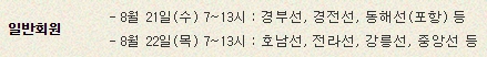 일반 회원들을 위한 기차표 예매는 그 다음 주인 8월 21일(수)과 8월 22일(목)에 진행됩니다. 8월 21일에는 경부선, 경전선, 동해선(포항) 등의 노선이, 8월 22일에는 호남선, 전라선, 강릉선, 중앙선 등의 노선이 예매 대상입니다. 예매 시간은 오전 7시부터 오후 1시까지로, 많은 사람들이 접속하기 때문에 예매 시작 시간에 맞춰 준비하는 것이 좋습니다.