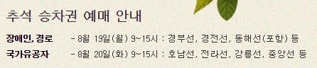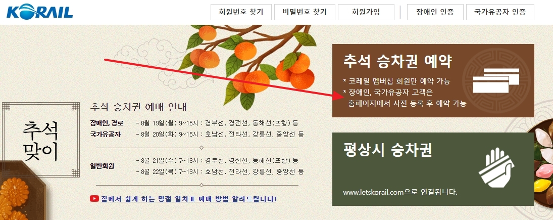 1. 레츠코레일 홈페이지에 들어가면 추석 맞이 열차표 예매에 관한 안내가 나옵니다. 이 페이지에서는 장애인, 국가유공자, 일반회원의 예매 일정과 함께, 예매에 필요한 사전 준비 사항을 확인할 수 있어요.