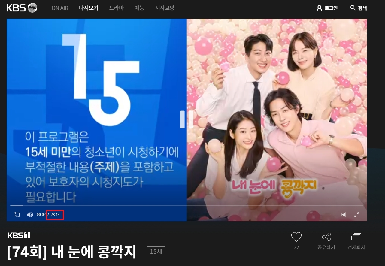 11. 재생된 영상에서 시간을 확인할 수 있습니다. 예를 들어, 28분 14초 동안 재생되는 경우도 있는데요. 일반적으로 일일 드라마나 아침 드라마 같은 경우는 이렇게 무료로 전체 회차를 제공하는 경우가 많습니다. 반면, 주말 드라마나 프라임 타임에 방영되는 드라마는 미리보기만 제공될 수 있습니다.