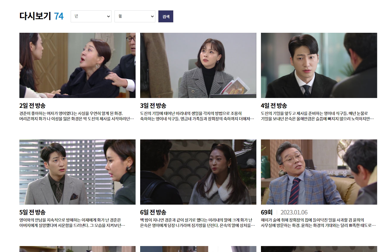 6. 다시보기를 클릭하면, 드라마의 에피소드 목록이 나열됩니다. 이 목록에서 보고 싶은 회차를 선택하여 클릭합니다. 예를 들어, 가장 인상 깊었던 장면이 있는 회차나 놓친 회차를 선택해 다시 볼 수 있습니다.