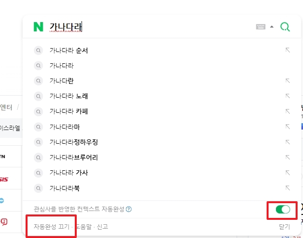 검색을 했을 때, 관심사를 반영한 자동완성 기능과 일반 자동완성 기능이 있는데, 이를 통해 보다 빠르게 원하는 정보를 찾을 수 있습니다. 만약 자동완성 기능이 필요하지 않다면 설정에서 끌 수 있으며, 관심사 반영 기능만 비활성화할 경우 일반 자동완성 기능만 사용할 수 있습니다.