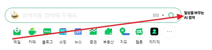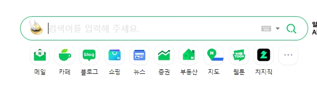 사용하고 싶은 서비스를 찾기 위해서는 검색창을 사용하면 됩니다. 검색창 바로 아래에는 메일, 카페, 블로그, 웹툰, 지도 등 다양한 서비스에 쉽게 접근할 수 있도록 아이콘으로 잘 정리되어 있습니다.