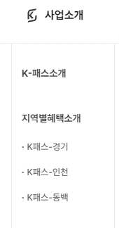 3. 사업소개 메뉴에서는 K-패스의 개요와 함께 지역별 혜택 소개를 확인할 수 있습니다. 여기서 경기도, 인천, 동백의 혜택이 어떻게 구성되어 있는지 알아볼 수 있어요.