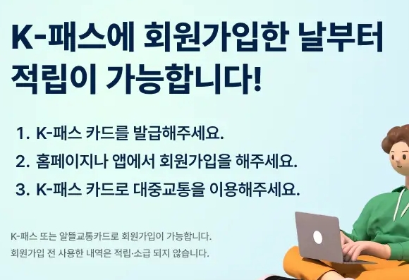 2. K-패스에 회원가입을 하면, 가입한 날부터 적립이 가능하다는 안내를 받을 수 있습니다. 이 안내는 K-패스 카드 발급, 홈페이지나 앱을 통한 회원가입, 그리고 대중교통 이용 시 적립되는 포인트에 대한 정보를 담고 있어요.