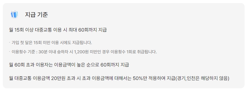 8. 지급 기준에서는 월 15회 이상 대중교통을 이용할 시 최대 60회까지 지급이 가능하다는 내용을 안내합니다. 이용 첫 달에는 15회 미만 이용 시에도 지급된다는 유용한 정보도 포함되어 있습니다.