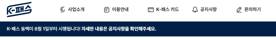 1. K-패스 홈페이지에 접속하면 메인 화면에서 주요 메뉴들을 확인할 수 있습니다. 사람들은 이곳에서 사업 소개, 이용 안내, K-패스 카드 정보, 공지사항, 문의하기 등의 메뉴를 통해 필요한 정보를 찾아볼 수 있어요.