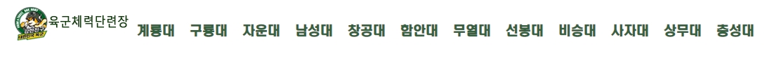4. 홈페이지 하단에는 육군체력단련장의 여러 지부들이 나열되어 있습니다. 계룡대, 구룡대, 자운대, 남성대, 창공대, 함안대, 무열대, 선봉대, 비승대, 사자대, 상무대, 충성대 등의 지부들이 있으며, 각 지부의 정보를 클릭하여 자세히 확인할 수 있습니다.