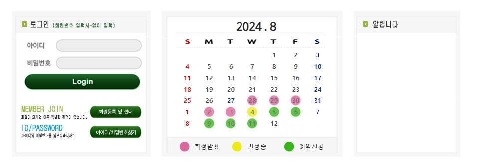 3. 화면 중간에는 로그인 창과 함께 예약 달력이 표시되어 있어요. 회원 로그인 후, 달력에서 원하는 날짜를 선택해 예약을 진행할 수 있습니다. 달력에서는 축령발표일, 평성중, 예약신청일 등 중요한 날짜들이 색상으로 구분되어 있어 한눈에 확인할 수 있습니다.