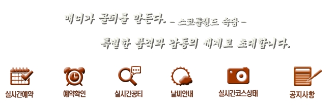 2. 홈페이지에 접속하면 메인 화면에 메이커 골퍼를 만든다! - 스코틀랜드의 혼과 특별한 품격과 감동의 세계로 초대합니다.라는 문구가 눈에 들어옵니다. 이와 함께 실시간 예약, 예약확인, 실시간공지, 날씨안내, 실시간코스상태, 공지사항 등의 메뉴를 한눈에 확인할 수 있습니다. 이 메뉴들은 각각의 기능에 따라 필요한 정보를 빠르게 제공해 줍니다.