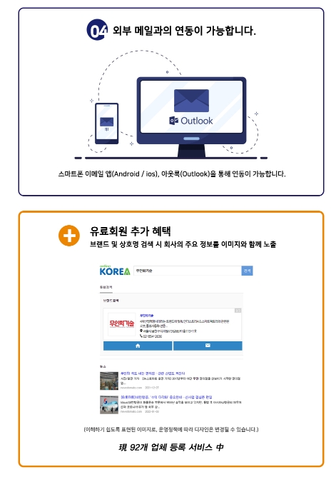 6. 코리아닷컴 메일의 장점 중 하나로는, 만약 업체명이 x코리아와 같이 코리아로 끝나는 경우, 이메일 주소가 외우기 쉽고 기억에 잘 남을 수 있다는 점입니다. 또한, 아이디를 간단하게 영어와 숫자 조합으로 구성할 수 있어, 메일 주소 자체가 깔끔하게 보일 수 있습니다. 이는 기업 이미지 관리 측면에서 메리트가 있을 수 있습니다.