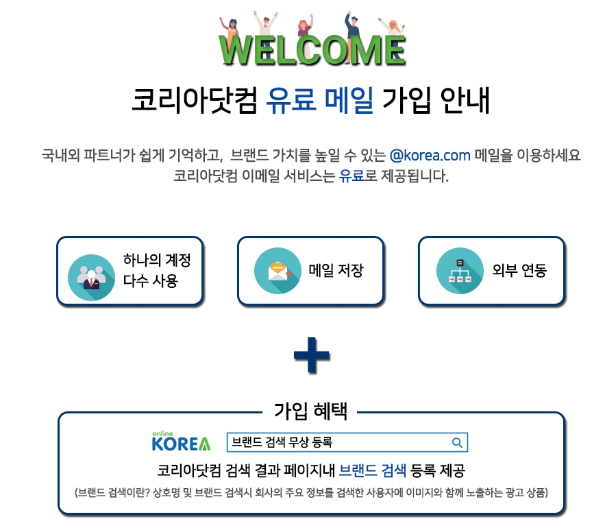 4. 회원가입 절차를 진행하다 보면, 코리아닷컴 메일이 유료 서비스임을 알 수 있습니다. 하나의 계정을 다수가 사용할 수 있고, @korea.com 도메인을 사용하는 이메일 주소를 제공한다는 점이 특징입니다. 이러한 유료 서비스는 개인보다는 기업이나 단체에서 사용하기에 적합할 수 있습니다.
