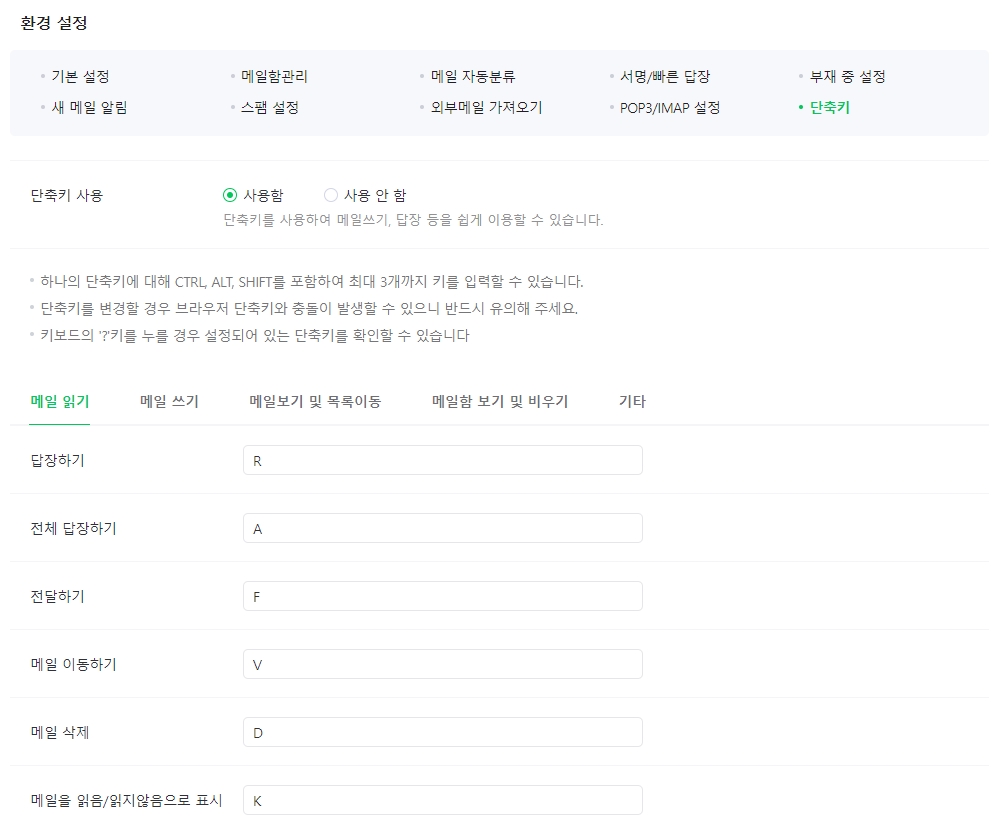 6. 단축키 설정에서는 메일을 사용할 때 편리하게 이용할 수 있는 단축키를 설정할 수 있어요. 단축키를 사용하면 메일 읽기, 쓰기, 답장하기 등의 작업을 빠르게 처리할 수 있습니다.