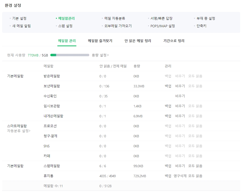 4. 메일함 관리에서는 각 메일함의 용량을 관리하고, 메일함을 정리할 수 있는 다양한 옵션을 제공합니다. 여기서 사용하지 않는 메일함을 비우거나, 특정 메일함을 백업하는 기능도 있어요.