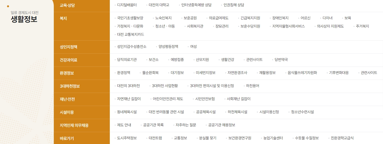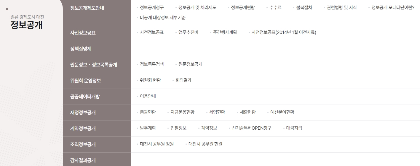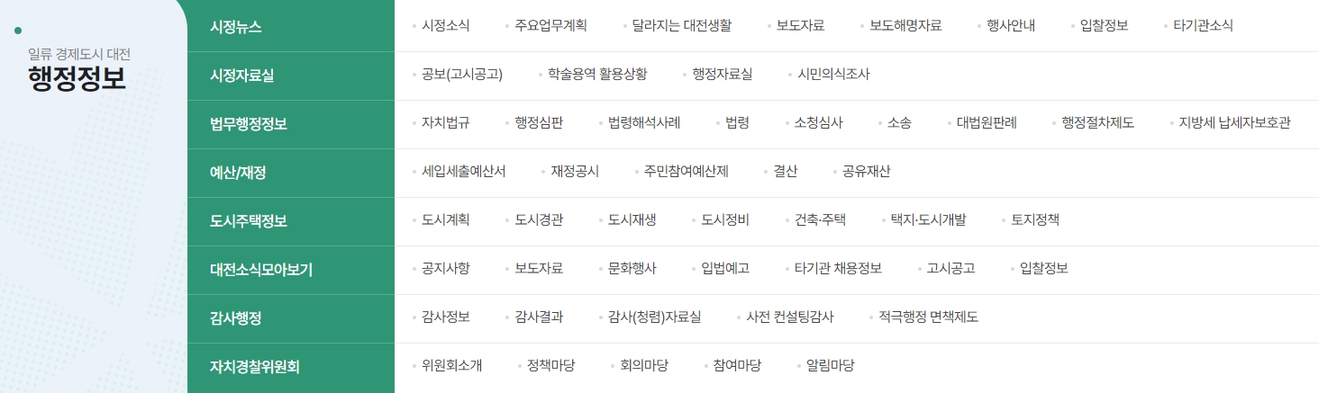 5. 행정정보 메뉴에서는 시정뉴스, 시정자료실, 법무 행정정보, 예산 및 재정정보, 도시주택 정보, 대전소식 모아보기, 감사 행정, 자치경찰위원회 등의 다양한 행정 관련 정보를 안내합니다.