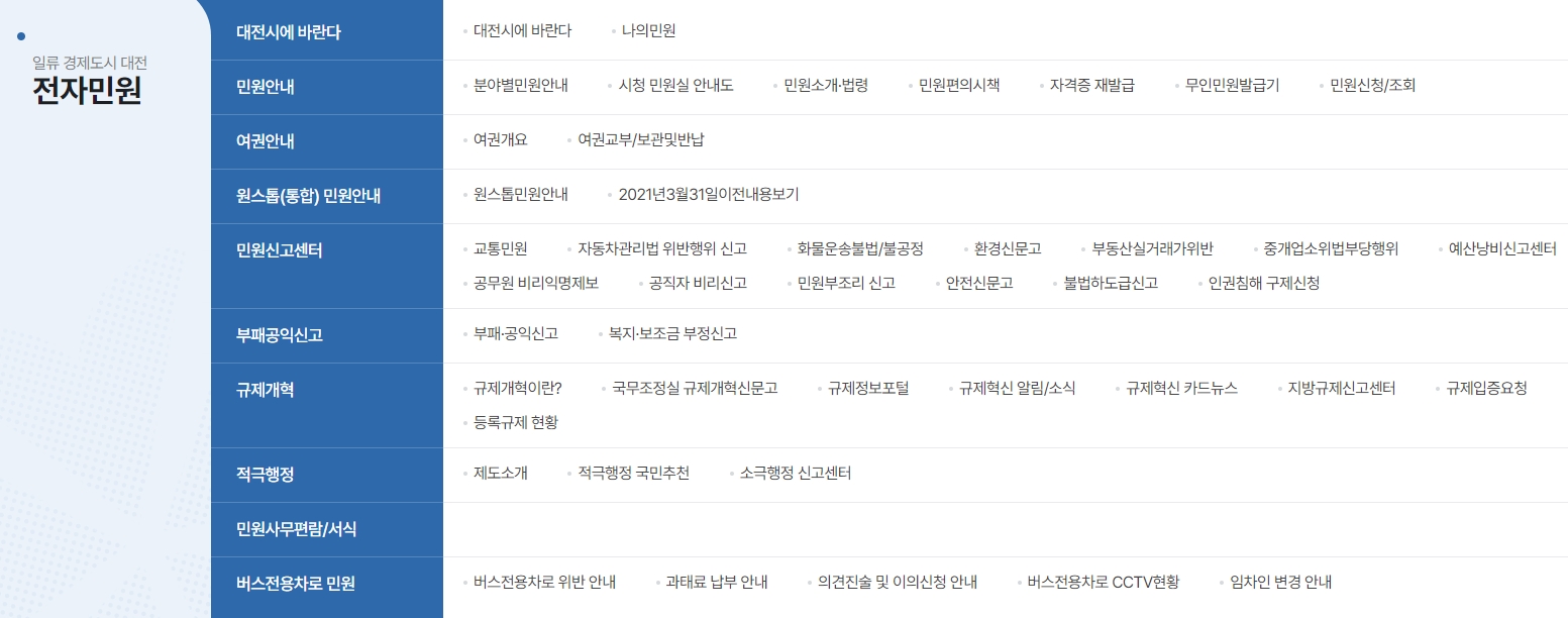 4. 전자민원 메뉴에서는 대전시에 바란다, 민원안내, 여권안내, 원스톱 민원안내, 민원신고센터, 부패 공익 신고, 규제개혁, 적극행정 등의 서비스를 제공하여 시민들이 온라인으로 쉽게 민원을 처리할 수 있도록 돕고 있습니다.