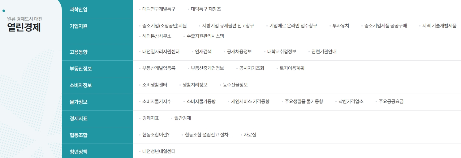 6. 열린경제 메뉴에서는 과학산업, 기업지원, 고용동향, 부동산 정보, 소비자 정보, 물가 정보, 경제지표, 협동조합, 청년정책 등 대전의 경제와 관련된 정보들을 종합적으로 제공합니다.