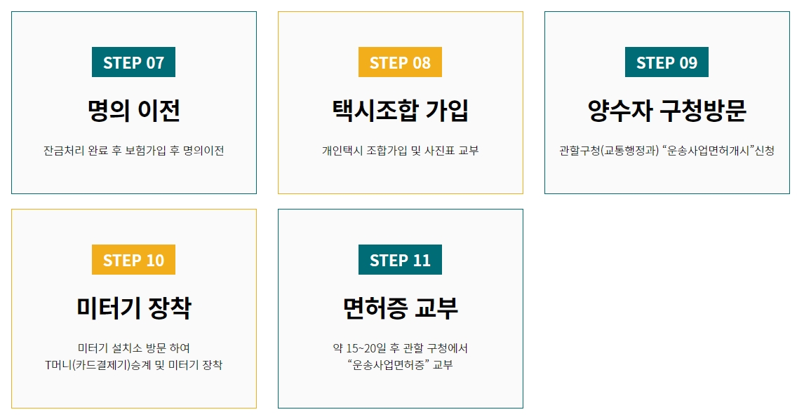 다음으로, 명의 이전 절차를 진행하고 보험에 가입한 뒤, 개인택시 조합에 가입하고 사진표를 받습니다. 관할 구청에 운송사업면허개시를 신청하고, 미터기 설치소에서 T머니 기기를 승계 받고 미터기를 장착합니다. 마지막으로 약 15~20일 후에 구청에서 운송사업면허증을 받고, 그제서야 개인택시 운영을 시작할 수 있습니다. 이 모든 과정은 개인택시 면허 매매에 필요한 절차로, 이를 잘 이해하고 따라야 합니다.