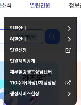 4. 열린민원 메뉴를 클릭하면 민원 안내, 여권 안내, 민원 신청, 민원 처리 공개 등의 서비스를 이용할 수 있습니다. 또한, 채무힐링행복상담센터와 같은 시민을 위한 상담 서비스도 제공하고 있습니다.