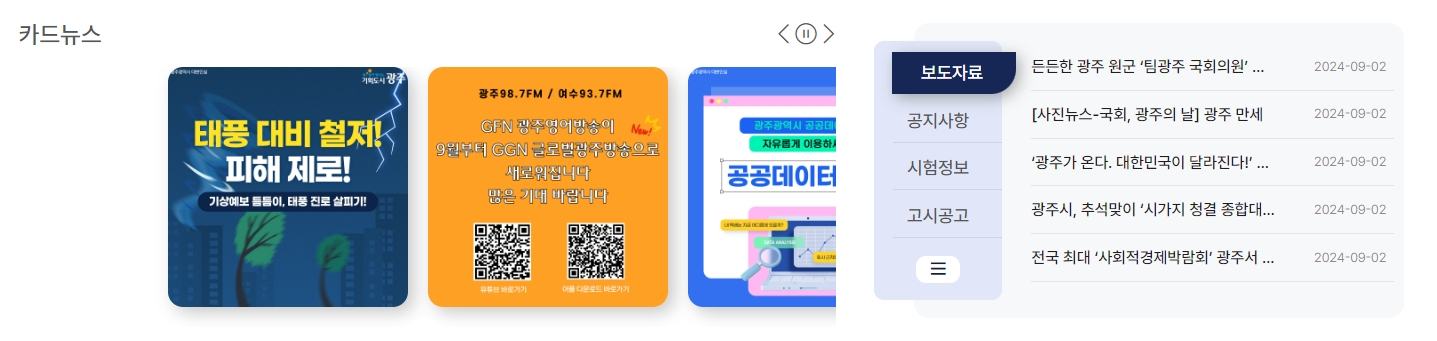 9. 홈페이지에는 카드뉴스 형식으로 주요 소식이나 이벤트 정보를 시각적으로 제공하는 섹션도 있습니다. 이를 통해 시민들은 중요한 정보를 한눈에 파악할 수 있습니다.