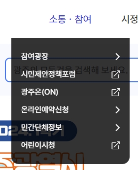2. 상단 메뉴의 소통·참여를 클릭하면 시민들이 참여할 수 있는 여러 정보를 제공합니다. 여기에는 시민제안정책포럼, 온라인 예약신청, 민간단체 정보, 어린이시청 등 다양한 항목이 포함되어 있습니다.