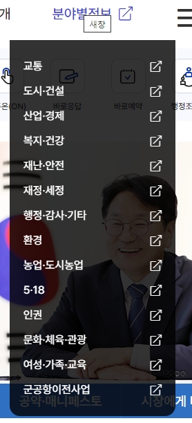 7. 분야별 정보 메뉴는 광주시의 다양한 분야에 대한 정보를 제공하며, 교통, 도시·건설, 산업·경제, 복지·건강, 재난·안전, 재정·세정, 환경, 농업·도시농업 등으로 세분화되어 있습니다. 각 분야의 최신 정보와 정책 등을 이곳에서 확인할 수 있습니다.