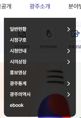 6. 광주소개 메뉴에서는 일반현황, 시정구호, 시청안내, 시의 상징, 홍보영상, 광주통계, 광주의 역사 등의 정보를 제공합니다. 이를 통해 광주시에 대한 전반적인 이해를 높일 수 있습니다.