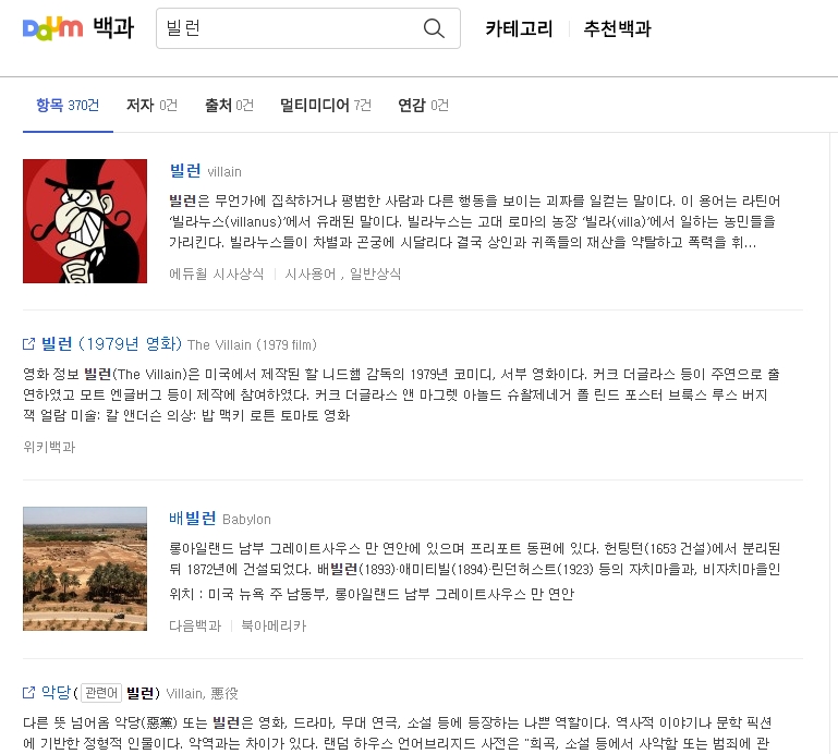 1. 다음백과에 접속한 뒤, 빌런을 검색해요. 빌런은 단순히 악당을 의미하는 단어가 아니고, 다양한 상황에서 여러 가지로 사용될 수 있는 단어예요. 특히 영화나 만화, 소설에서 주로 등장하는 캐릭터나 행동을 설명할 때 자주 쓰이는 용어로 자리 잡았어요.