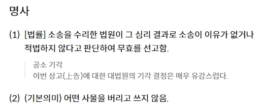 2. 검색창에 ‘기각’이라는 단어를 입력하여 검색합니다. 검색 결과로 나타나는 정의에 따르면, ‘기각’은 소송을 수리한 법원이 그 심리 결과를 바탕으로 소송의 이유가 없거나 적법하지 않다고 판단하여 해당 소송을 무효로 선고하는 행위를 의미합니다. 예를 들어, 민사 소송에서 제기된 청구가 법적인 근거가 부족하거나 사실상 성립되지 않는다고 판단될 때, 법원은 그 청구를 기각하게 됩니다.
