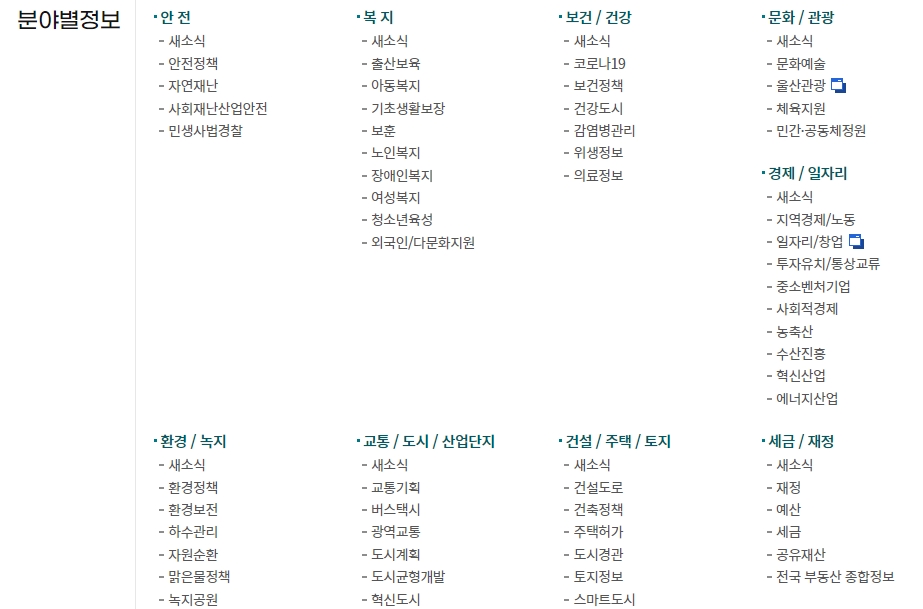 8. 분야별 정보에서는 울산시의 여러 분야에 대한 정보가 아주 꼼꼼하게 정리되어 있습니다. 안전, 복지, 환경, 교통, 경제 등 다양한 분야에 대한 정보들이 가득하죠. 각 분야별로 최신 소식과 정책을 쉽게 확인할 수 있도록 잘 정리되어 있어요.