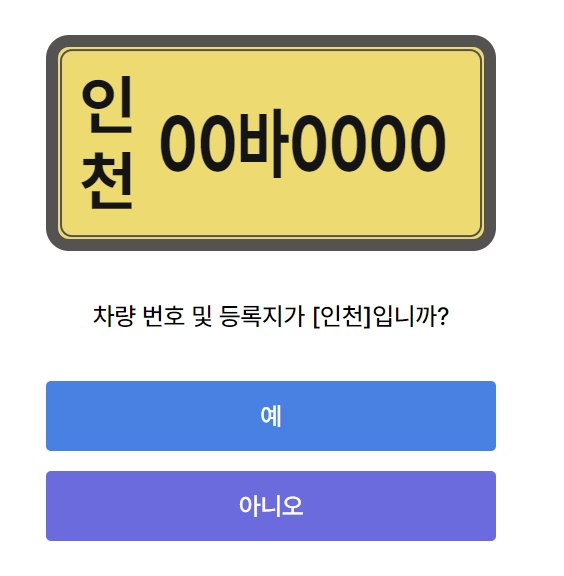 6. 교육 신청 시 차량 번호와 등록지를 확인하는 과정도 있습니다. 화면에 인천 지역 차량 번호판이 나오면, 해당 차량이 맞는지 예 또는 아니오를 선택해주시면 됩니다. 이 과정은 필수 확인 사항으로, 교육 신청 절차 중 하나로 꼭 거쳐야 하는 단계입니다. 등록 정보가 맞아야 교육 신청이 정상적으로 이루어지기 때문에, 신중하게 확인해 주세요.