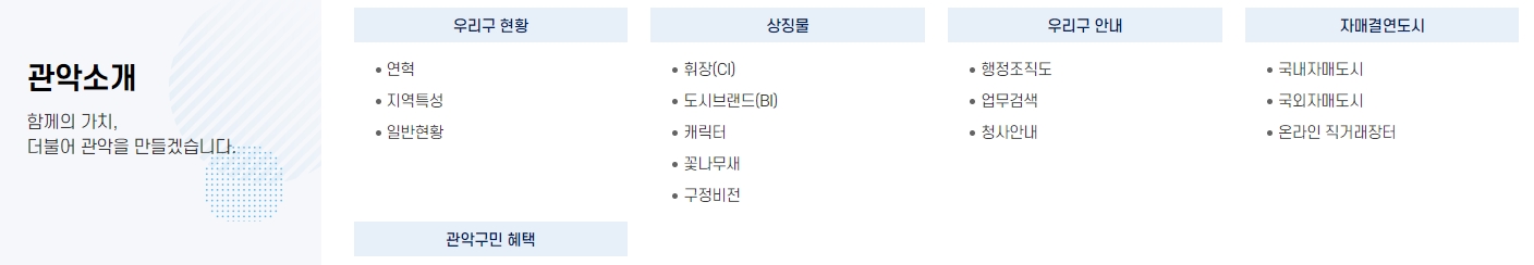 2. 관악구의 연혁, 지역 특성, 일반 현황뿐만 아니라, 구정의 상징물인 휘장, 도시브랜드, 캐릭터, 꽃나무새, 구정비전 등의 정보도 상세하게 제공하고 있어요. 예를 들어, 관악구의 상징물은 구의 역사와 문화적 배경을 반영하여 선정되었는데, 휘장은 관악구의 정체성을 나타내며, 꽃나무새는 지역의 자연 환경과 조화를 이루는 모습을 상징합니다. 이러한 상징물들은 구정 행사나 공식 문서에서 자주 활용되어 관악구민들에게 친숙하게 다가가고 있습니다.