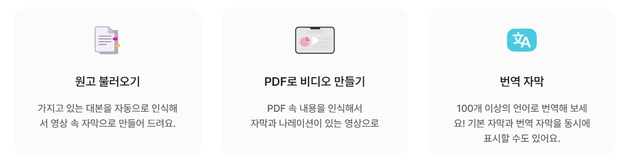 9. 원고 불러오기, PDF로 비디오 만들기, 번역 자막 같은 다양한 기능이 있어서 다양한 형태의 콘텐츠 제작에 활용할 수 있을 것 같습니다. 특히 100개 이상의 언어로 번역해주는 기능이 있어 국제적인 콘텐츠 제작에도 유용할 것 같아요.
